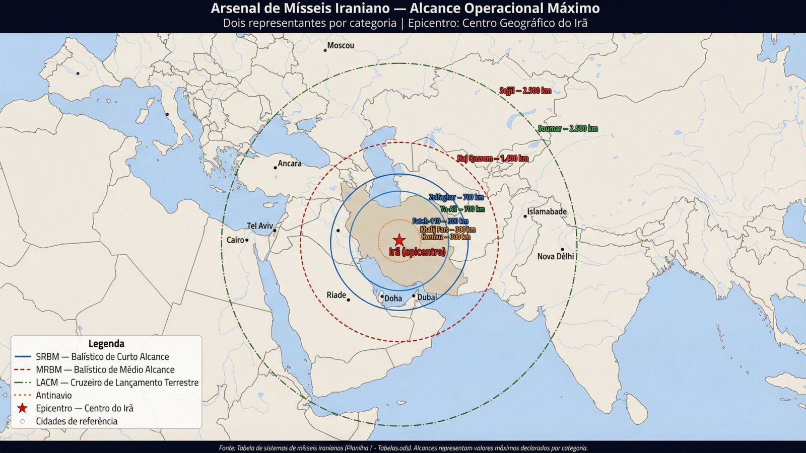 O arsenal de mísseis iranianos constitui o pilar central da estratégia de deterrência e projeção de força do Irã, combinando uma vasta gama de sistemas de armas com uma rede de veículos lançadores móveis (TELs – Transporter Erector Launchers, Transportador Eretor Lançador) que conferem mobilidade, dispersão e sobrevivência ao programa. No período coberto por esta análise (últimos três anos, de março de 2023 a março de 2026), o arsenal iraniano passou por um ciclo completo de construção, consumo maciço em combate, degradação severa e reconstrução acelerada.