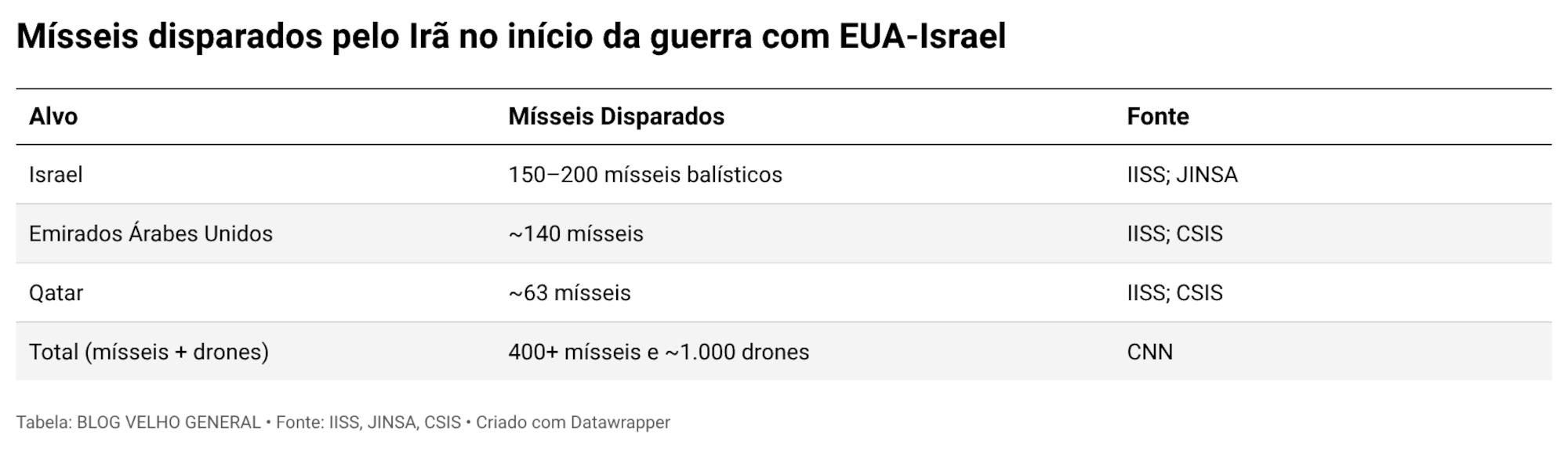 Fabian, Emanuel. IDF Assesses Iran Has Some 2,500 Ballistic Missiles, Was Accelerating Production. Times of Israel, 3 de março de 2026. https://www.timesofisrael.com/liveblog_entry/idf-assesses-iran-has-some-2500-ballistic-missiles-was-accelerating-production/.