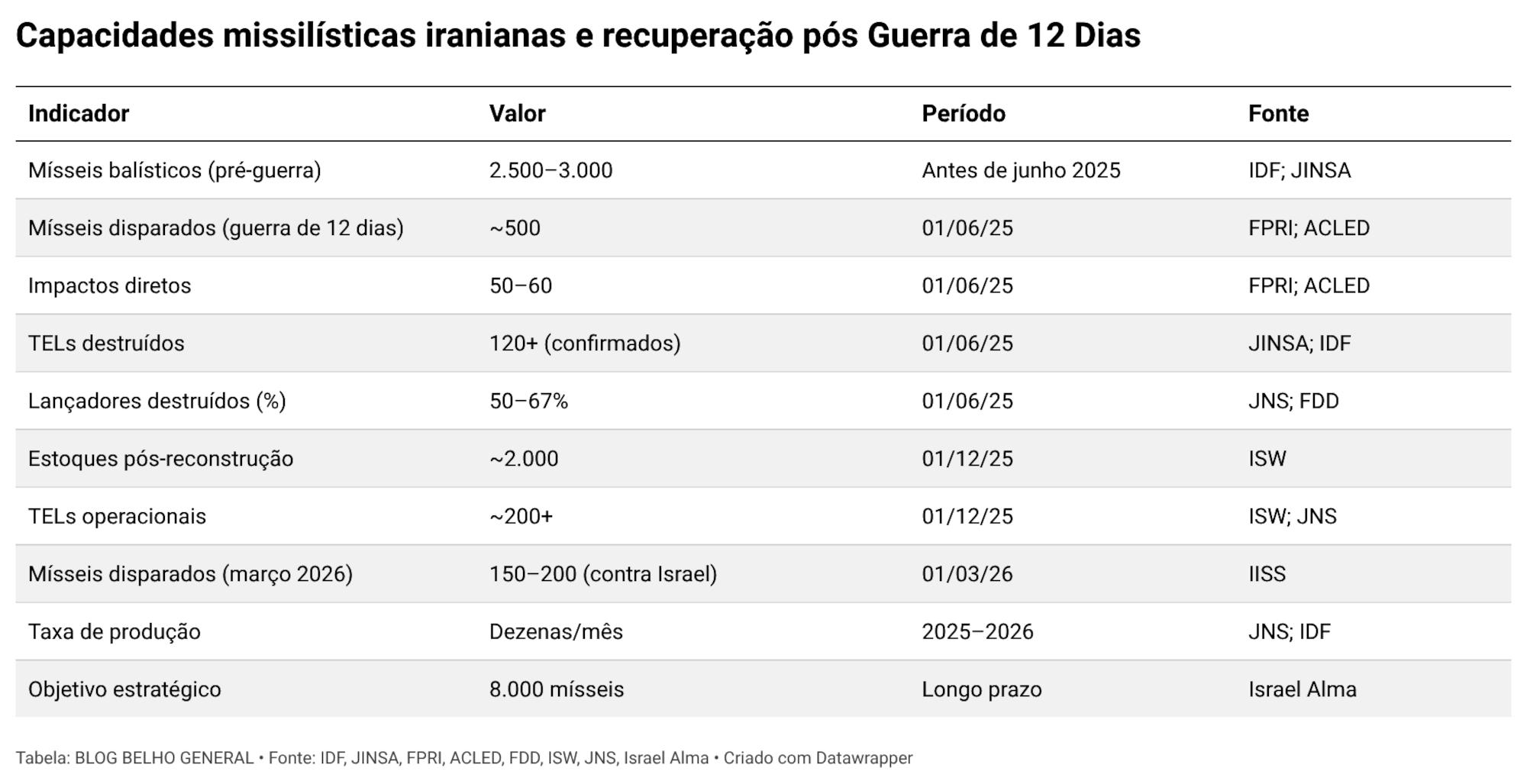 Cicurel, Ari. Iranian Ballistic Missile Estimates. Jewish Institute for National Security of America (JINSA), 16 de junho de 2025. https://jinsa.org/wp-content/uploads/2025/06/Iranian-Ballistic-Missile-Estimates-6-16-2025-1.pdf.