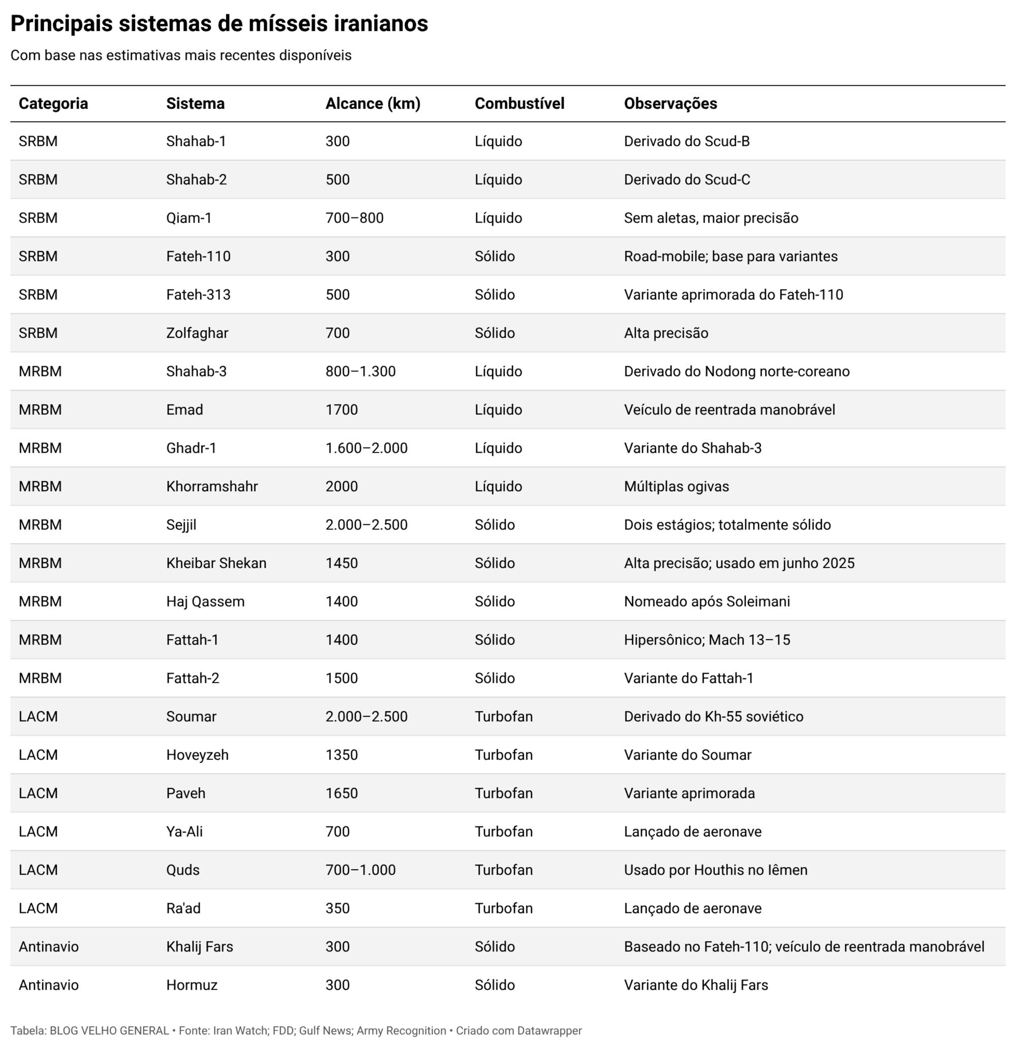 Table of Iran’s Missile Arsenal. Iran Watch (Wisconsin Project on Nuclear Arms Control), 26 de janeiro de 2026. https://www.iranwatch.org/our-publications/weapon-program-background-report/table-irans-missile-arsenal.