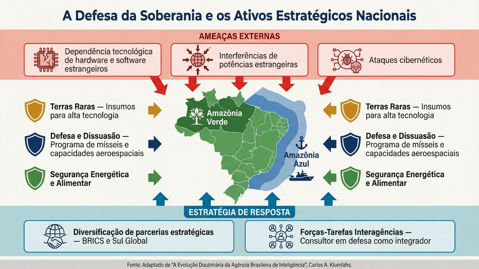 Diante desse panorama, as principais preocupações da inteligência brasileira devem ser em torno da proteção dos ativos estratégicos nacionais, pois é público e patente um aumento preocupante da interferência de potências estrangeiras sobre áreas sensíveis à nossa soberania.