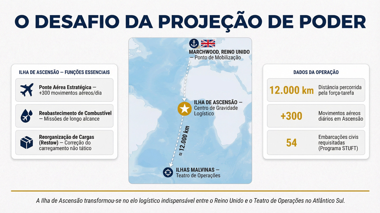 A Ilha de Ascensão rapidamente se tornou o verdadeiro centro de gravidade logístico da campanha britânica. Localizada a meio caminho entre o Reino Unido e o Atlântico Sul, ela assumiu um papel que ultrapassou em muito sua função original de base avançada. Em poucos dias, Ascensão transformou-se no principal ponto de convergência de tropas, equipamentos, aeronaves, munições e suprimentos destinados ao Teatro de Operações. A intensidade do fluxo logístico foi tamanha que, no auge da mobilização, registraram-se mais de 300 movimentos aéreos diários, envolvendo desde aeronaves de transporte estratégico até caças e bombardeiros empregados nas missões de longo alcance.