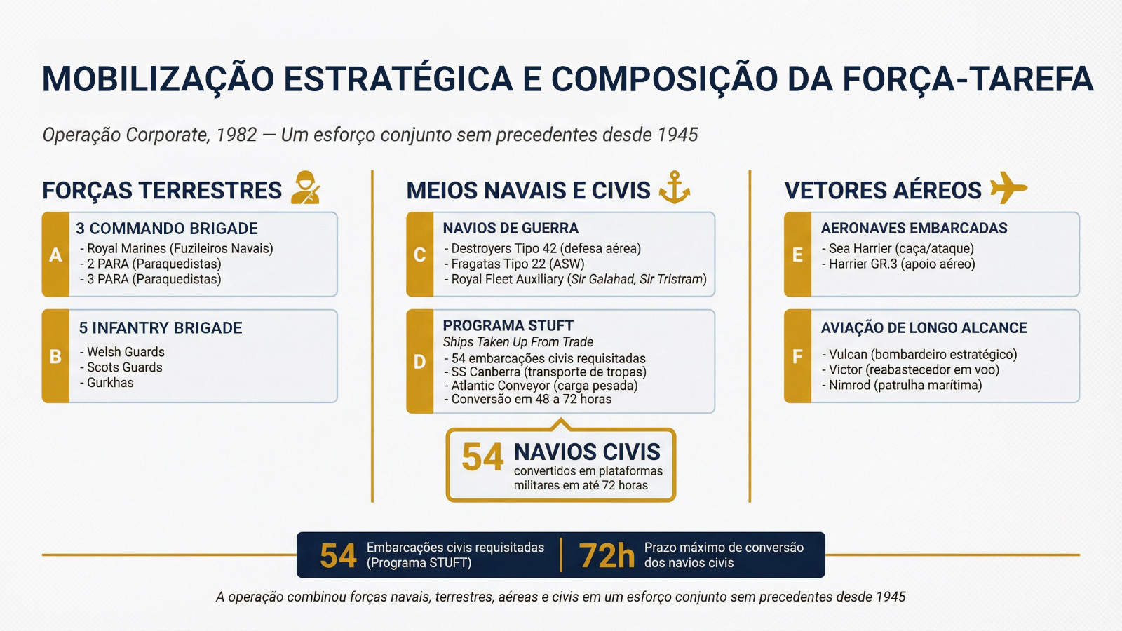 A partir de Marchwood, iniciou-se a mobilização acelerada de meios navais, terrestres e aéreos, bem como a requisição emergencial de navios civis por meio do programa Ships Taken Up From Trade (STUFT). Ao todo, 54 embarcações civis foram incorporadas ao esforço militar, incluindo cargueiros, transatlânticos, petroleiros e navios de apoio. A rapidez com que esses navios foram convertidos para uso militar impressionou observadores e demonstrou a capacidade industrial britânica de adaptação em situação de crise. Em muitos casos, modificações estruturais significativas foram realizadas em prazos de apenas 48 a 72 horas, como instalação de plataformas de pouso improvisadas, reforço de conveses, adaptação de compartimentos internos e integração de sistemas de comunicação militar.