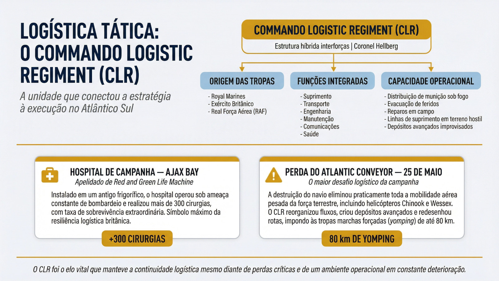 A logística tática britânica nas Falklands/Malvinas encontrou sua expressão mais completa no Commando Logistic Regiment(CLR), uma unidade singular que integrava, sob um único comando, funções de suprimento, transporte, engenharia, manutenção, comunicações e saúde.