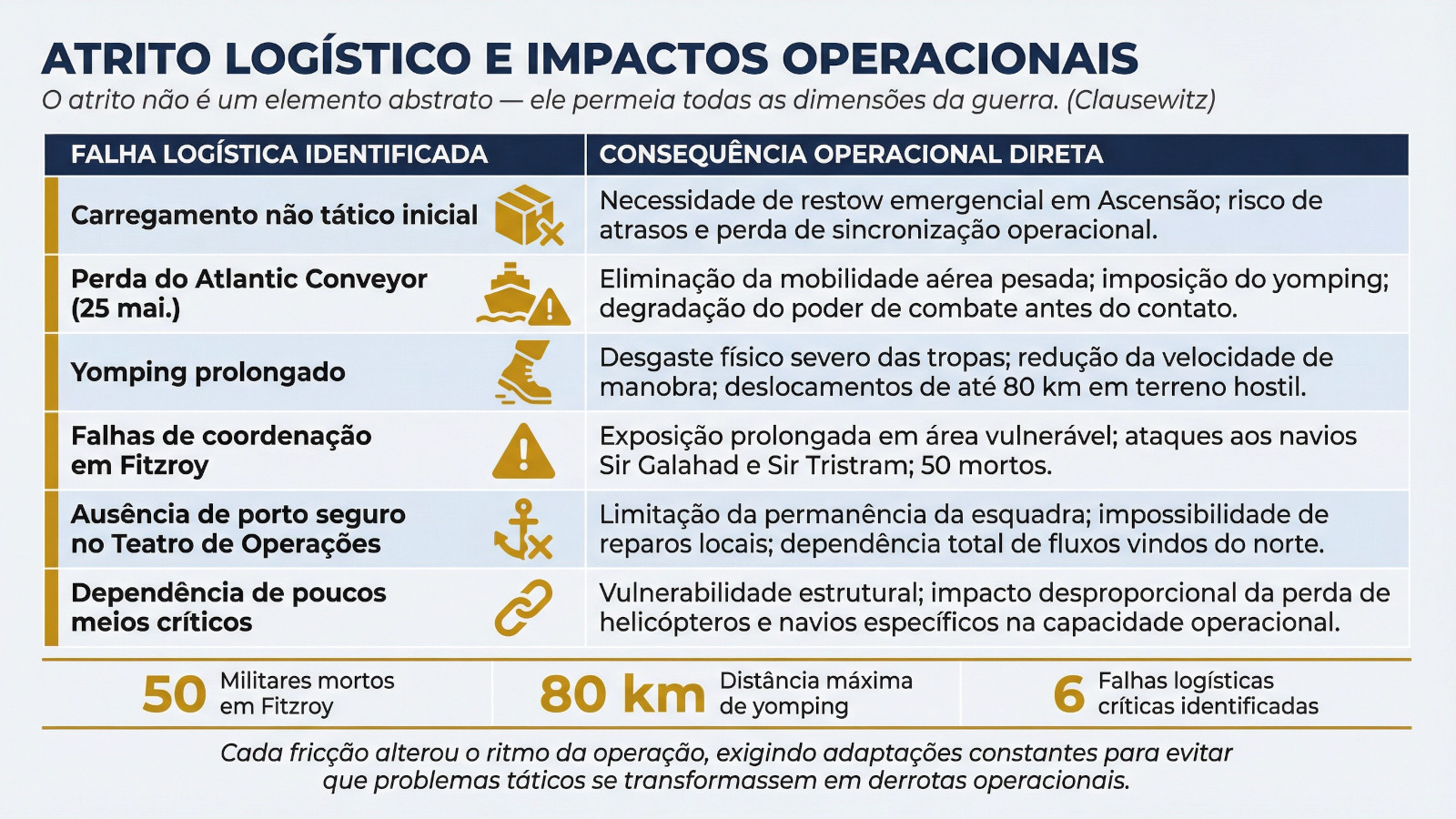 Todos esses episódios ilustram de maneira clara o conceito de atrito descrito por Clausewitz. Nas Falklands/Malvinas, o atrito logístico manifestou-se na forma de perdas inesperadas, falhas de coordenação, limitações estruturais e desgaste físico das tropas. Cada uma dessas fricções alterou o ritmo da operação, exigindo adaptações constantes e decisões rápidas para evitar que problemas táticos se transformassem em derrotas operacionais. A campanha demonstrou que o atrito não é um elemento abstrato, mas uma força concreta que permeia todas as dimensões da guerra, especialmente a logística.
