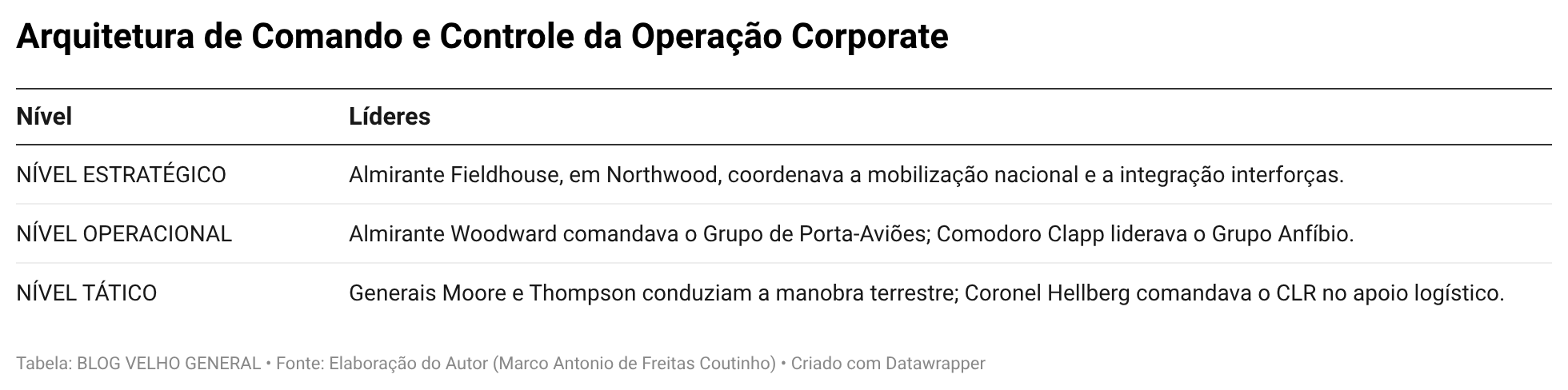 A operação foi conduzida sob uma arquitetura de Comando e Controle distribuída, concebida para mitigar os efeitos da distância estratégica entre o Reino Unido e o Teatro de Operações.