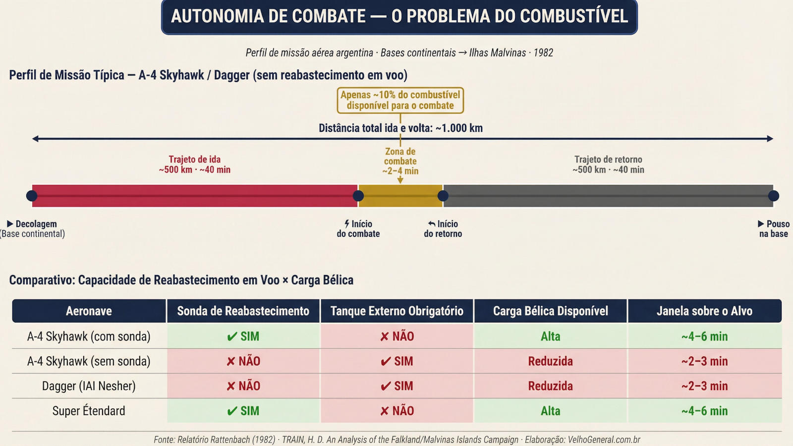 A heterogeneidade na capacidade de reabastecimento em voo impôs restrições operacionais significativas. Enquanto parte dos caças A-4 Skyhawk possuíam sondas para reabastecimento aéreo, muitos A-4 e os Dagger, de origem israelense, não dispunham desse sistema. Consequentemente, dependiam de tanques externos subalares, o que reduzia drasticamente sua carga bélica. Essa limitação comprometeu a eficácia da campanha aérea: considerando um percurso de ida e volta superior a 1.000 quilômetros a partir das bases continentais, o combustível reservado para o combate era mínimo. O resultado foi uma janela de tempo exígua para localizar e atacar os navios da frota britânica, sob risco constante de falta de combustível para retornar à base.