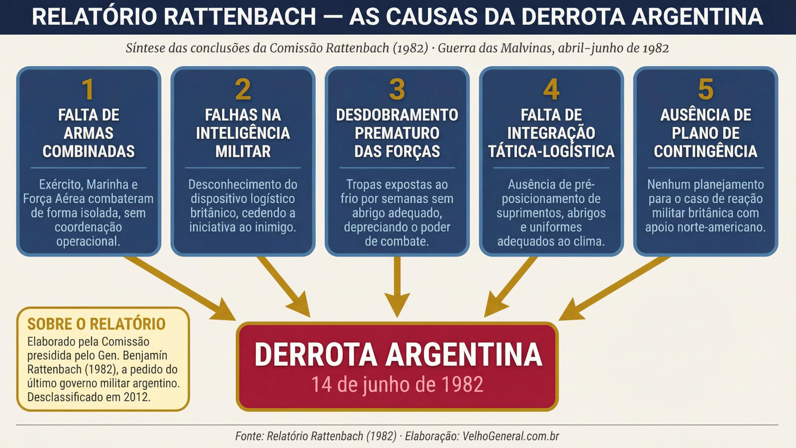 1 O general Benjamín Rattenbach (1898-1984) foi um oficial do Exército Argentino. Embora não tenha participado do conflito, presidiu a Comissão encarregada de investigar as causas da derrota militar argentina nas Malvinas, trabalho que resultou no histórico Relatório Rattenbach. O documento distingue-se pela franqueza e honestidade das análises, mostrando-se realista e severamente crítico quanto ao comando militar argentino, evidenciando a negligência na estratégia, táticas e logística, entre outros aspectos. O relatório constitui uma peça fundamental para compreender as falhas do comando argentino e suas respectivas causas.