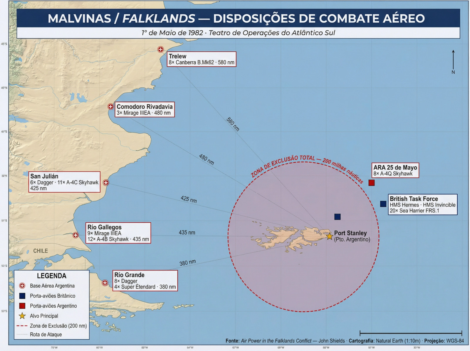 3 Um batalhão estava na Terra do Fogo, dois estavam ao oeste de Comodoro Rivadavia e os outros dois em Neuquén, ma fronteira com o Chile. O motivo foi o Exército chileno realizava manobras ao longo da Patagônia Chilena no momento do conflito, favorecendo os interesses britânicos ao criar uma distração importante. Para Pinochet não era conveniente o fortalecimento político e militar da Argentina na região devido às questões limítrofes pendentes. Ele apostou na geopolítica favorável ao Reino Unido e acertou.