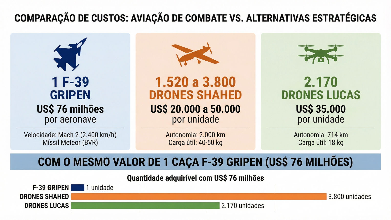 A aviação de combate oferece flexibilidade, capacidade de reemprego e versatilidade que mísseis não possuem. O Gripen pode realizar missões de superioridade aérea, interdição, reconhecimento e ataque ao solo – versatilidade que justifica o custo unitário mais elevado.