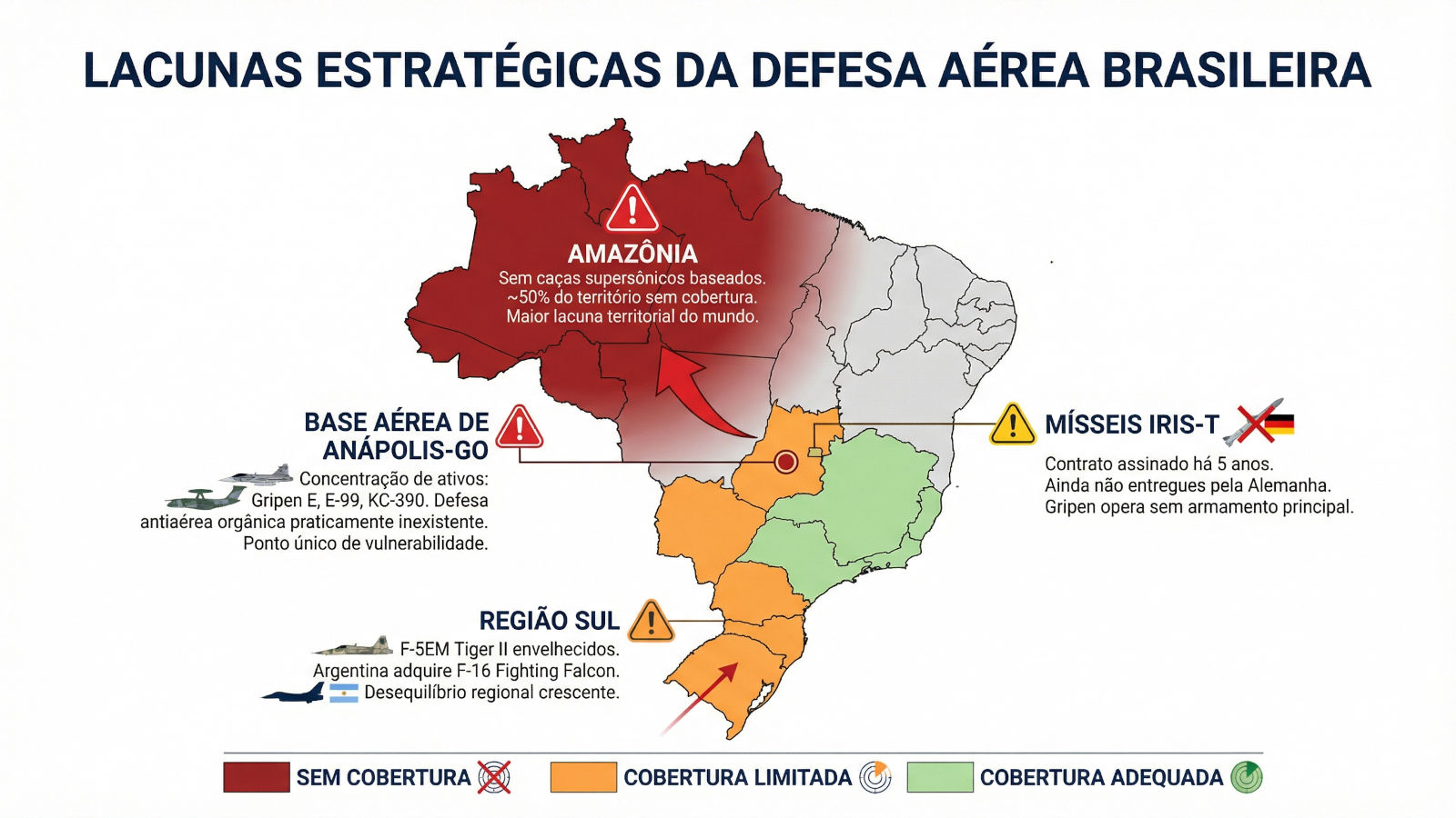 Apesar do avanço representado pelo programa Gripen, a FAB enfrenta lacunas estruturais que podem comprometer sua capacidade de se contrapor à moderna artilharia antiaérea de longo alcance e aos radares térmicos.