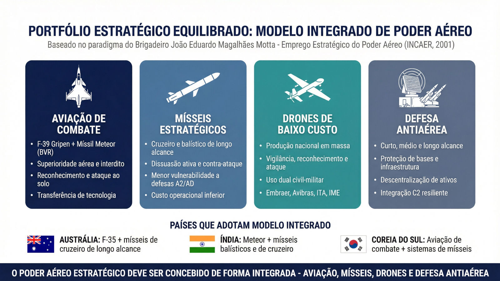 A comparação com países em condições próximas quanto ao tamanho, PIB e ameaças revela que o Brasil não é uma exceção. Países como Austrália, Índia e Coreia do Sul mantêm programas combinados de aviação de combate e sistemas de mísseis estratégicos, reconhecendo a complementaridade entre ambos.