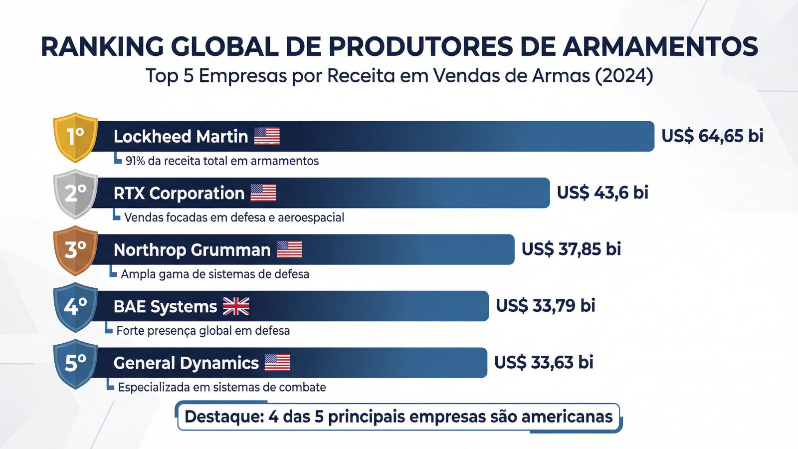 O mercado permanece altamente concentrado em firmas dos EUA, que ocupam quatro das cinco primeiras posições globais. A Lockheed Martin lidera o ranking com US$ 64,65 bilhões em vendas de armas, o que representa 91% de sua receita total. O Top 5 é completado por RTX Corporation (US$ 43,6 bi), Northrop Grumman (US$ 37,85 bi), a britânica BAE Systems (US$ 33,79 bi) e a General Dynamics (US$ 33,63 bi).