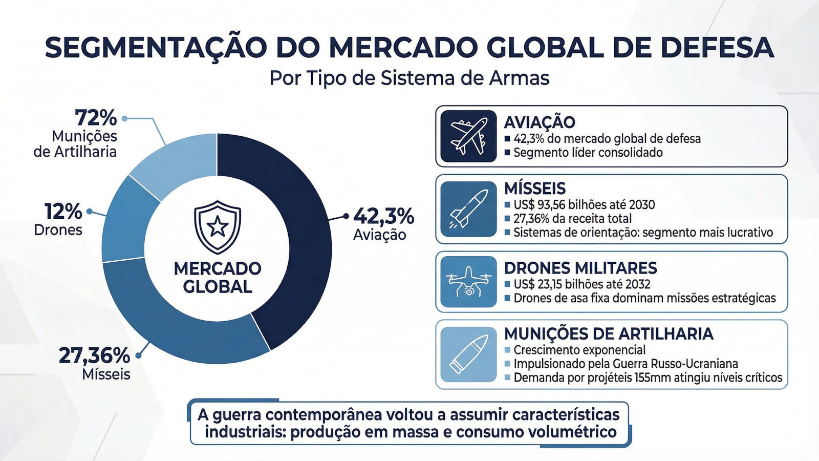 Segmentação do mercado global de defesa por tipo de sistema de armas. A aviação lidera com 42,3% de participação, seguida pelos mísseis, cujo mercado global é estimado em US$ 93,56 bilhões até 2030, com os sistemas de orientação respondendo por 27,36% da receita total do segmento. O mercado de drones militares é avaliado em US$ 23,15 bilhões até 2032. As munições de artilharia, impulsionadas pela Guerra Russo-Ucraniana, registram crescimento exponencial, com a demanda por projéteis de 155mm atingindo níveis críticos e forçando investimentos industriais não vistos desde a Segunda Guerra Mundial (SIPRI; “Missile Market Size, Share & Trends Analysis Report, 2030”. Grand View Research, 2024).