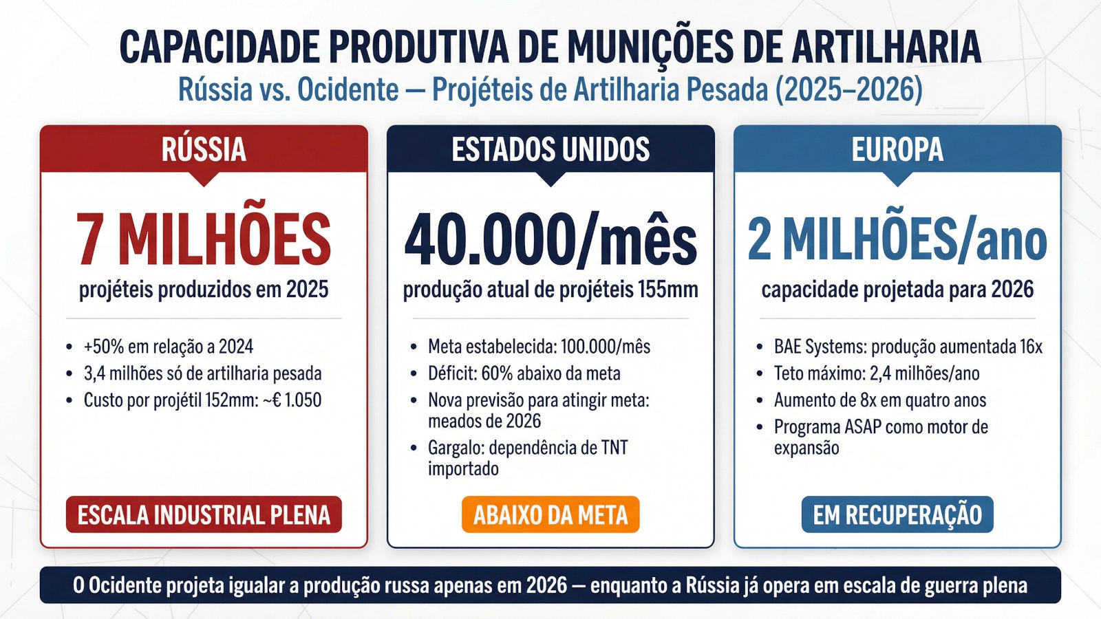Comparação da capacidade produtiva de munições de artilharia pesada entre Rússia, EUA e Europa (2025–2026). A Rússia produziu sete milhões de projéteis de todos os tipos em 2025 – aumento de 50% em relação a 2024 –, dos quais 3,4 milhões são munições de obuseiro. O Exército dos EUA estabeleceu a meta de 100.000 projéteis de 155mm por mês, mas atingiu apenas 40.000 unidades mensais em 2025, com nova previsão de alcançar a meta apenas em meados de 2026, em razão de gargalos na cadeia de suprimentos e da dependência de TNT importado. A Europa projeta capacidade de dois milhões de projéteis anuais em 2026, podendo chegar a 2,4 milhões, o que representaria um aumento de oito vezes em quatro anos (DEFENSE EXPRESS. “In 2025, Russia Broke Its Ammunition Output Record, Producing 7M Shells Worth €10.6B”, 2026; LUCKENBAUGH, Josh. “Army Falls Short of 155mm Production Goal”. National Defense Magazine, 14 de agosto de 2025; SIPRI, 2024–2026).