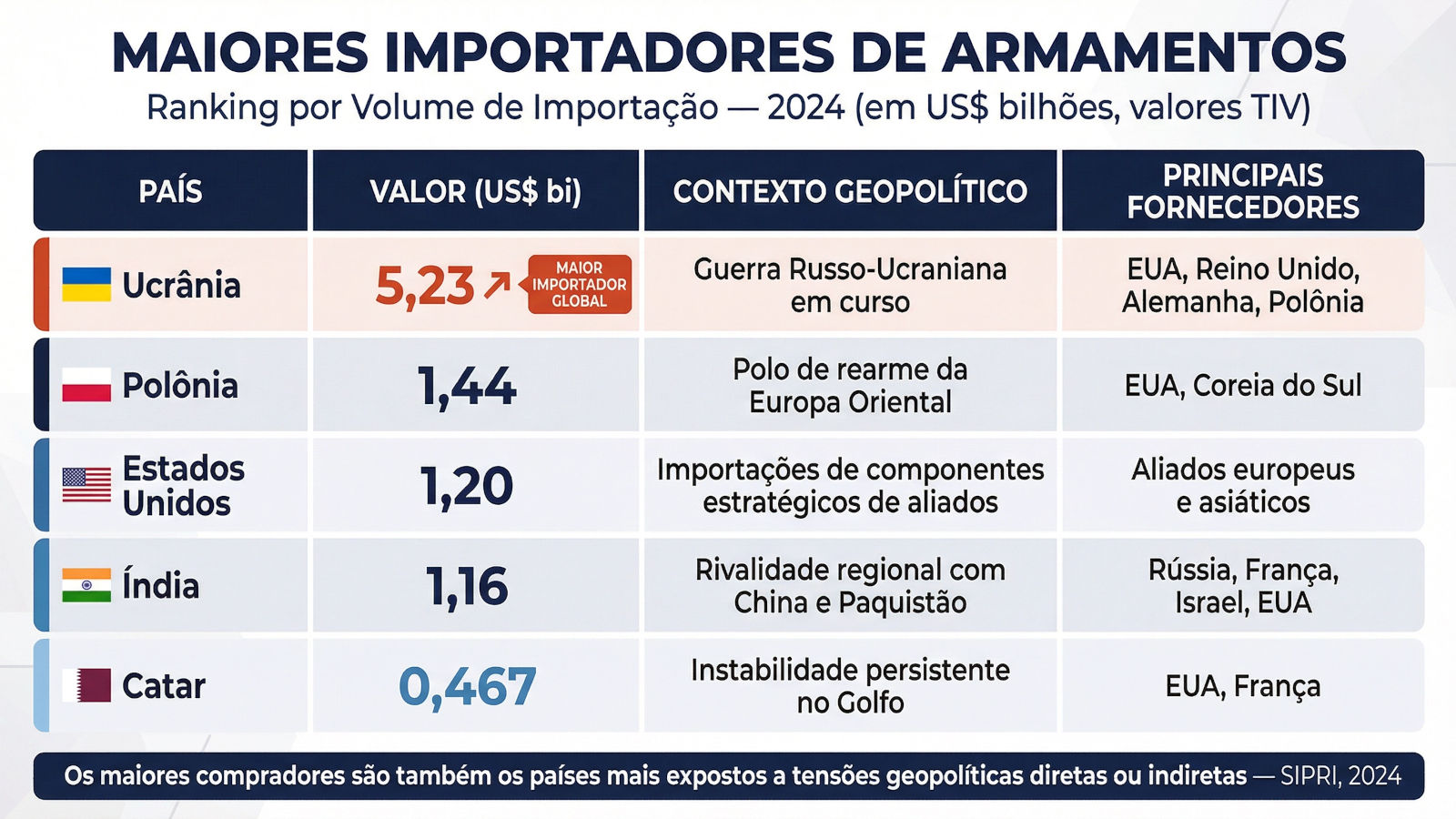 Ranking dos cinco maiores importadores de armamentos em 2024, medido em Trend Indicator Values (TIV), metodologia do SIPRI para comparação de transferências de armas em valores padronizados. A Ucrânia tornou-se o maior comprador mundial, com US$ 5,23 bilhões em importações impulsionadas pela guerra de alta intensidade contra a Rússia, em dependência quase total de fornecedores externos. A Polônia emergiu como principal polo de rearme da Europa Oriental, com US$ 1,44 bilhão em aquisições que incluem tanques K2, obuseiros K9, sistemas Patriot e aeronaves F-35. A Índia mantém posição constante entre os maiores compradores, diversificando fornecedores em resposta às rivalidades regionais com China e Paquistão. O Catar investe em sistemas de defesa aérea e aeronaves de combate, refletindo a instabilidade persistente no Golfo (SIPRI, Stockholm International Peace Research Institute. Arms Transfers Database. Trend Indicator Values (TIV), 2024).