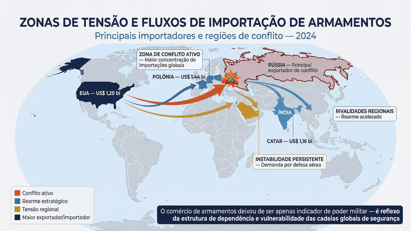 Mapa dos principais fluxos de importação de armamentos e zonas de tensão estratégica em 2024. As setas indicam as principais rotas de transferência de armamentos, com destaque para o corredor Ocidente-Ucrânia, que concentra o maior volume de importações globais (US$ 5,23 bilhões). A Polônia emerge como polo de rearmamento da Europa Oriental, enquanto a Índia intensifica aquisições em resposta às rivalidades regionais com China e Paquistão. O Golfo Pérsico mantém demanda persistente por sistemas de defesa aérea, refletida nas importações do Catar. A Rússia opera simultaneamente como principal ator de conflito e como vetor de pressão sobre as cadeias globais de suprimento de armamentos. O mapa é ilustrativo e baseado em dados de transferências de armas; as fronteiras representadas não implicam posicionamento político (SIPRI, Stockholm International Peace Research Institute. Arms Transfers Database. Trend Indicator Values (TIV), 2024. Elaboração própria).