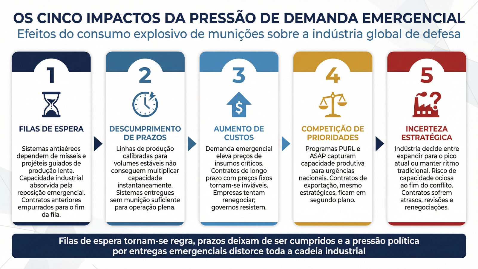 Os cinco impactos estruturais do consumo explosivo de munições antiaéreas e da pressão de programas emergenciais sobre a indústria global de defesa. Os impactos formam uma cadeia causal: a absorção da capacidade produtiva pela reposição emergencial gera filas de espera (1), que resultam no descumprimento sistemático de prazos (2); a demanda por insumos críticos provoca aumento abrupto de custos (3); programas como o PURL e o ASAP intensificam a competição entre prioridades nacionais e compromissos internacionais (4); e o conjunto dessas pressões cria incerteza estratégica sobre a sustentabilidade da demanda no pós-conflito (5). Para os países compradores, o risco é que mesmo contratos assinados e parcialmente pagos possam ser ultrapassados por prioridades de última hora (Análise do autor com base em SIPRI; CALCBENCH. “Order Backlog at Defense Contractors”. Calcbench Blog, 22 de abril de 2025; BADHWAR, Colby. “United States Arms Sales Experience Continued Growth in Fiscal Year 2025”. Defense Archives, 23 de março de 2026).