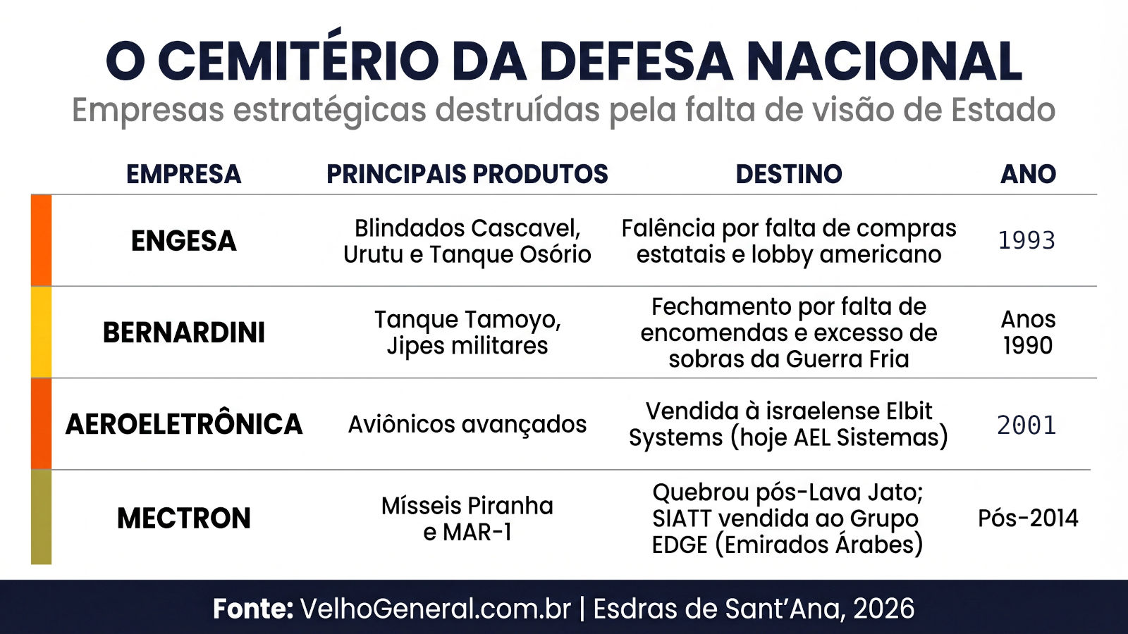 Para entender o verdadeiro risco que a Avibras ainda corre – e por que a mobilização para conceder a Ordem do Mérito Militar ao Sindicato dos Metalúrgicos de São José dos Campos e Região é uma urgência geopolítica –, é preciso olhar com coragem para o cemitério da indústria bélica nacional.