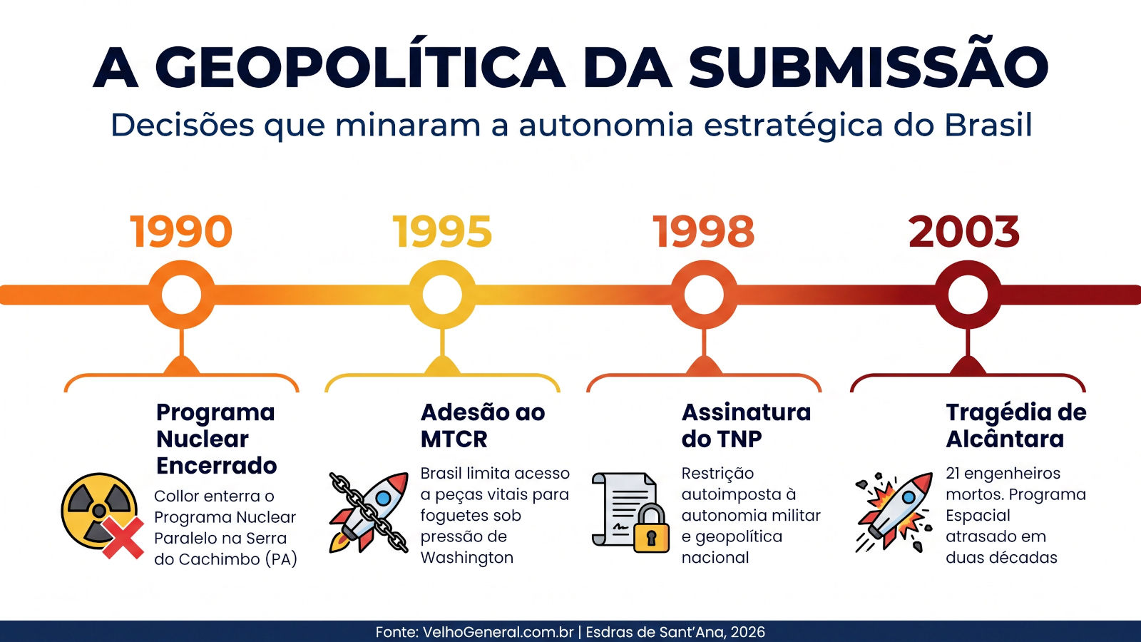 Em 1990, o então presidente Fernando Collor de Mello jogou, literalmente, uma pá de cal no poço de testes na Serra do Cachimbo (PA), encerrando de forma midiática o Programa Nuclear Paralelo. Em 1995, sob forte pressão de Washington, o Brasil aderiu ao Regime de Controle de Tecnologia de Mísseis (MTCR), limitando nosso próprio acesso a peças vitais para foguetes. Em 1998, durante o governo Fernando Henrique Cardoso, o país assinou o Tratado de Não Proliferação Nuclear (TNP), uma restrição autoimposta à nossa autonomia militar e geopolítica.