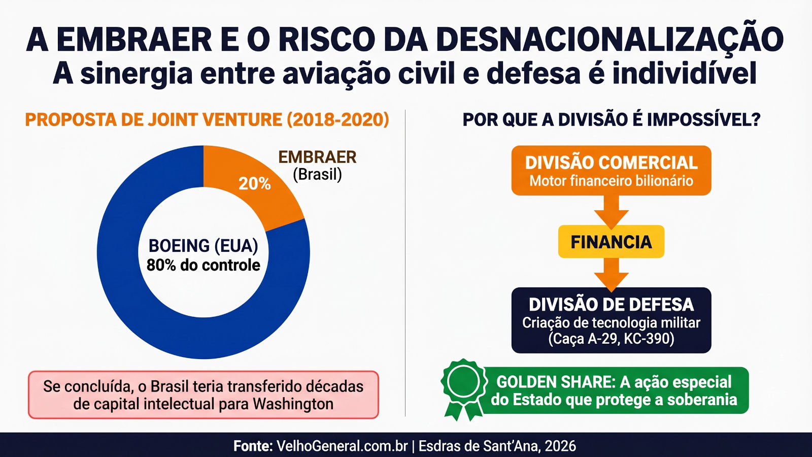 Entre 2018 e 2020, o Brasil esteve a uma canetada de entregar o controle da Embraer para a americana Boeing através de uma joint venture altamente desequilibrada (na qual os EUA teriam 80% do controle). O argumento oficial era que a divisão de Defesa (fabricante do caça A-29 e do cargueiro KC-390) ficaria de fora e “protegida”. Um erro estratégico crasso: na aviação civil e militar, a sinergia é indivisível. A divisão comercial é o motor financeiro de caixa bilionário que sustenta os caros laboratórios e os engenheiros que criam tecnologia militar. O próprio mecanismo de Golden Share (ação de classe especial do Estado) foi relativizado. Se a Boeing não tivesse recuado unilateralmente por conta da crise global dos seus aviões 737 MAX, o Brasil teria transferido décadas de capital intelectual para Washington.