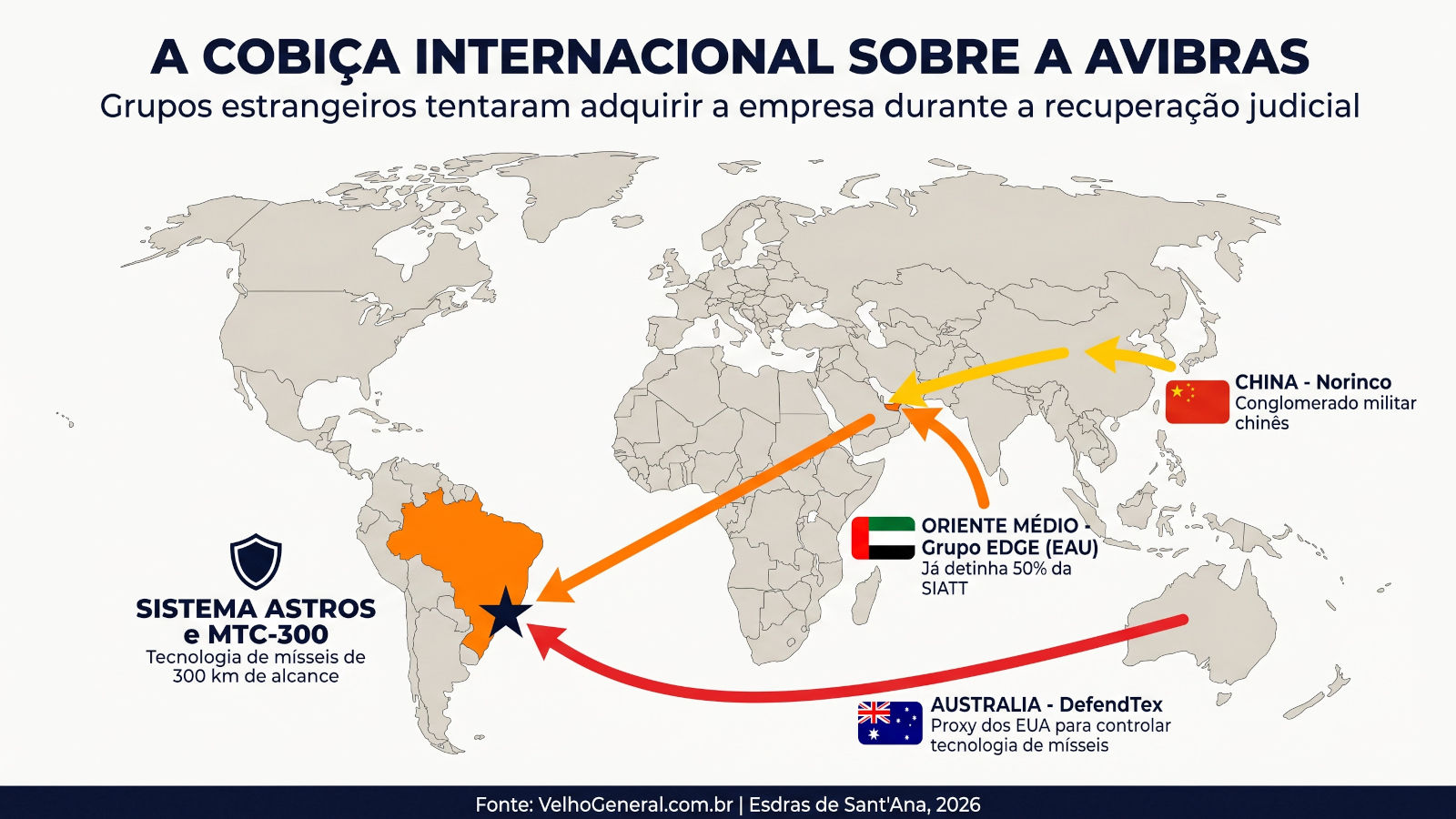 E, exatamente por isso, virou alvo da cobiça internacional, com grupos da Austrália (DefendTex), conglomerados da China (Norinco) e do Oriente Médio tentando comprá-la na bacia das almas durante sua recente recuperação judicial. O caso australiano, inclusive, expôs o escandaloso nível de investimento na ingerência externa sobre o Brasil: denúncias e análises de bastidores apontam que os Estados Unidos pressionaram e teriam oferecido mecanismos de financiamento para que a DefendTex concretizasse a compra. O objetivo de Washington era claro: usar a Austrália como proxy (um testa de ferro) para garantir que a tecnologia brasileira de mísseis fosse submetida aos interesses da órbita norte-americana, barrando o avanço brasileiro. Para eles, mais uma peça no tabuleiro; para nós, a entrega definitiva da nossa soberania tecnológica.